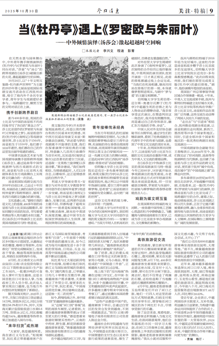 从利兹大学与对外经贸大学合作的《南柯仲夏梦》,到伯明翰大学与北京大学共同创作呈现的英文版《牡丹亭》……安塞尔感叹:“当双方年轻人在机场初次碰面时,仿佛老友重逢般自然。”