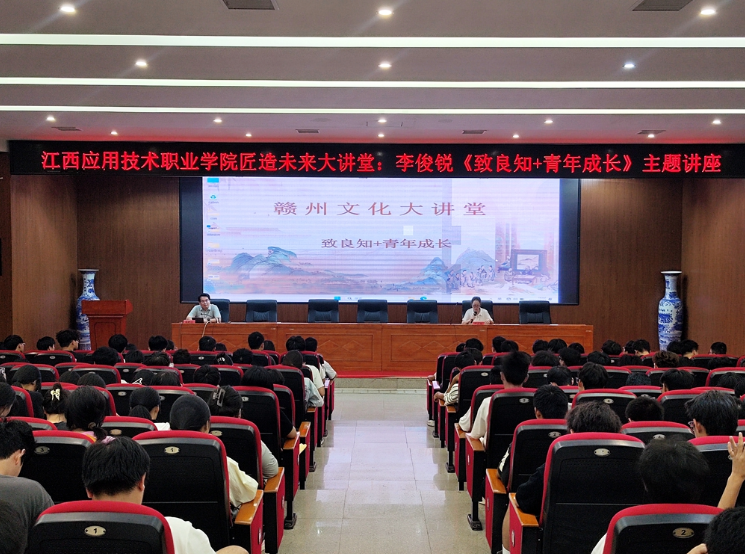 为推动中华优秀传统文化创造性转化、创新性发展,引导广大青年学生树立远大志向、涵养内在品格,日前,由江西应用技术职业学院宣传部主办,赣州市博物馆、映映通讯社承办的“匠造未来大讲堂”系列活动之“致良知+青年成长”主题讲座在图书馆报告厅成功举行。本次讲座特邀赣州市文化广电旅游局党组书记、局长李俊锐担任主讲。