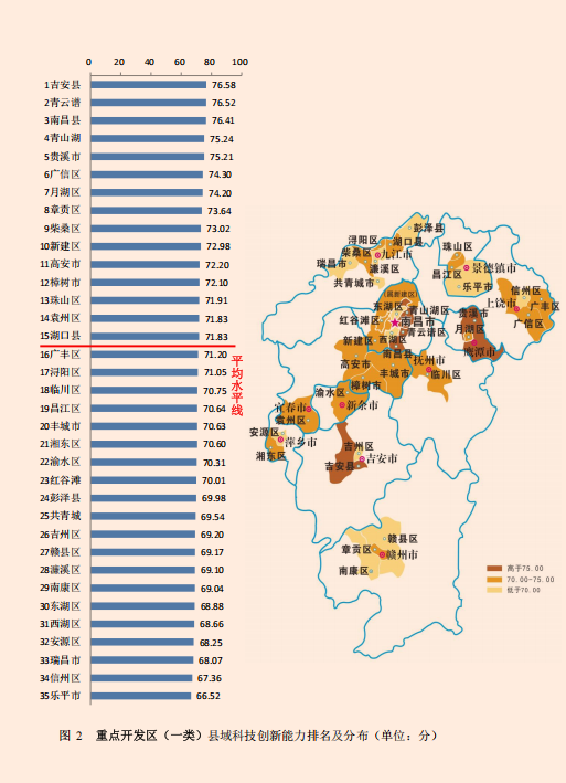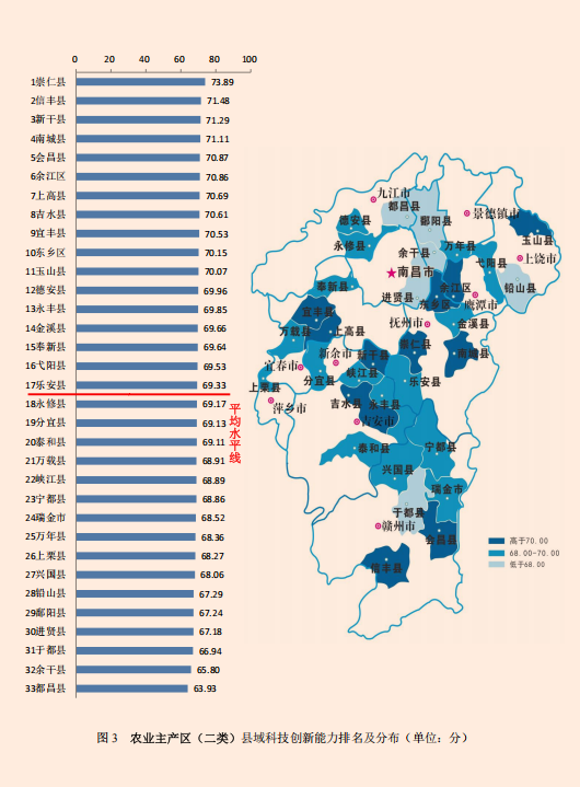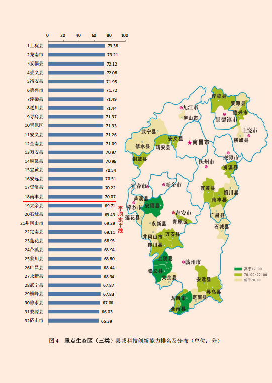 依据江西省主体功能区规划及各县区产业发展等情况,《报告》对全省县(市、区)按重点开发区(35个)、农业主产区(33个)、重点生态区(32个)进行分类比较分析。重点开发区平均得分为71.34,农业主产区平均得分为69.25,重点生态区平均得分为70.03。吉安市吉安县、抚州市崇仁县、赣州市上犹县分别位列各类区域第一。