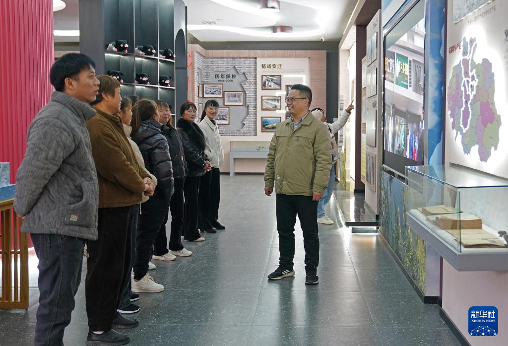 在位于江西省修水县县城的杭猪文化数字展示中心,卢丹(右一)向参观者介绍当地杭猪的养殖历史与文化(12月4日摄)。新华社记者 万象 摄