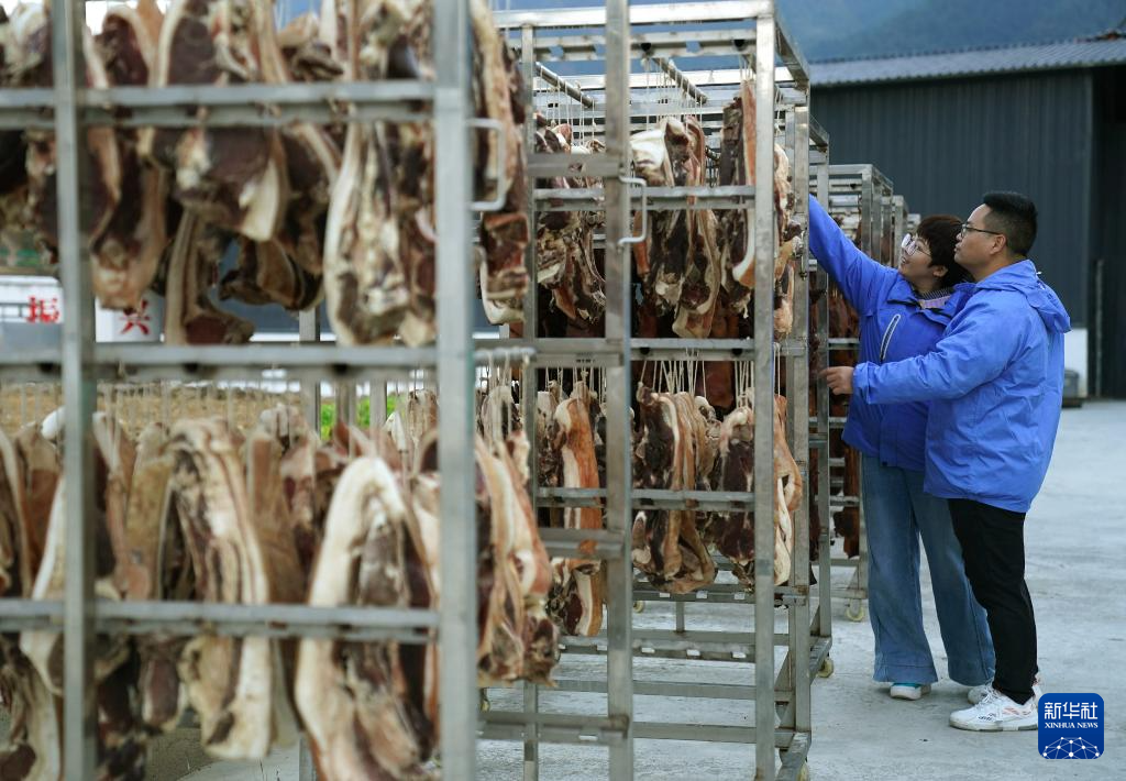 在位于江西省修水县港口镇红苏村的幕村杭猪加工基地,卢丹(右)与邹玲丽在查看晾晒的猪肉产品(12月3日摄)。新华社记者 万象 摄