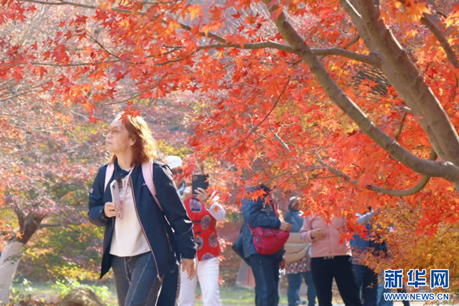 游客们在凤凰沟景区观赏红枫。新华网发