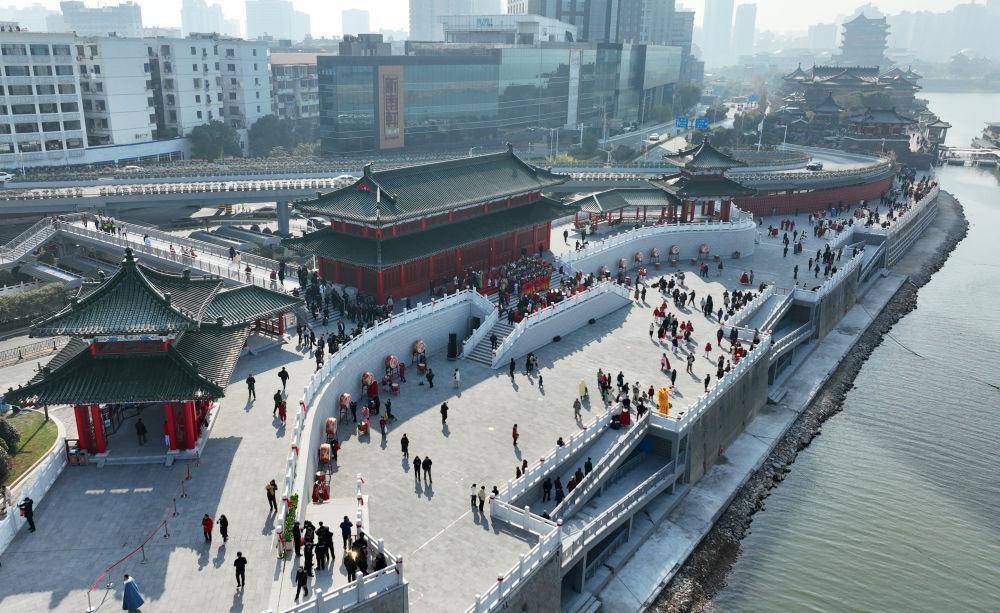 游人在南昌滕王阁景区北扩码头公园参观游览(无人机照片,摄于2025年1月1日)。 新华社记者 万象 摄