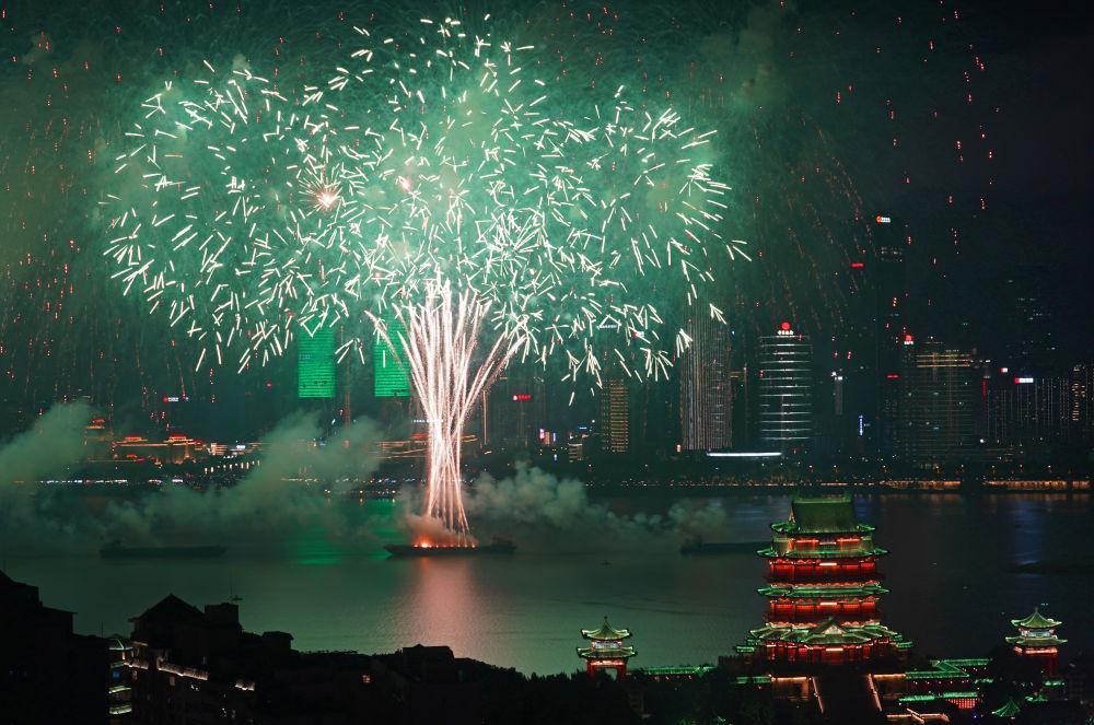 2025年10月1日,南昌市国庆烟花晚会在江西省南昌市赣江老官洲水域举办。 新华社记者 万象 摄