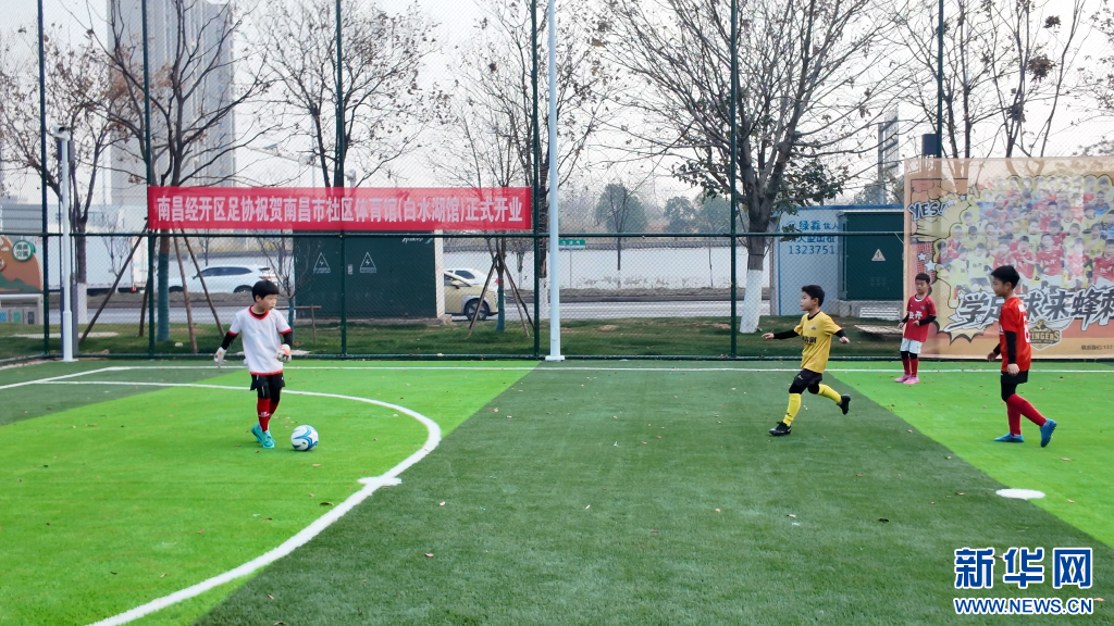 在南昌市社区体育馆白水湖馆配套足球场,小球员在踢足球。新华网发