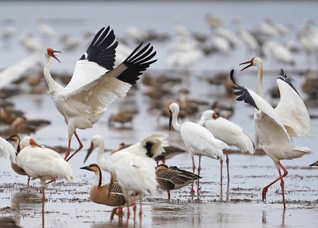 初春时节,上千只白鹤齐聚鄱阳湖畔的江西省上饶市余干县白鹤洲栖息觅食。它们时而凌空飞舞,时而滩涂嬉戏,构成一幅生机盎然的生态画卷。