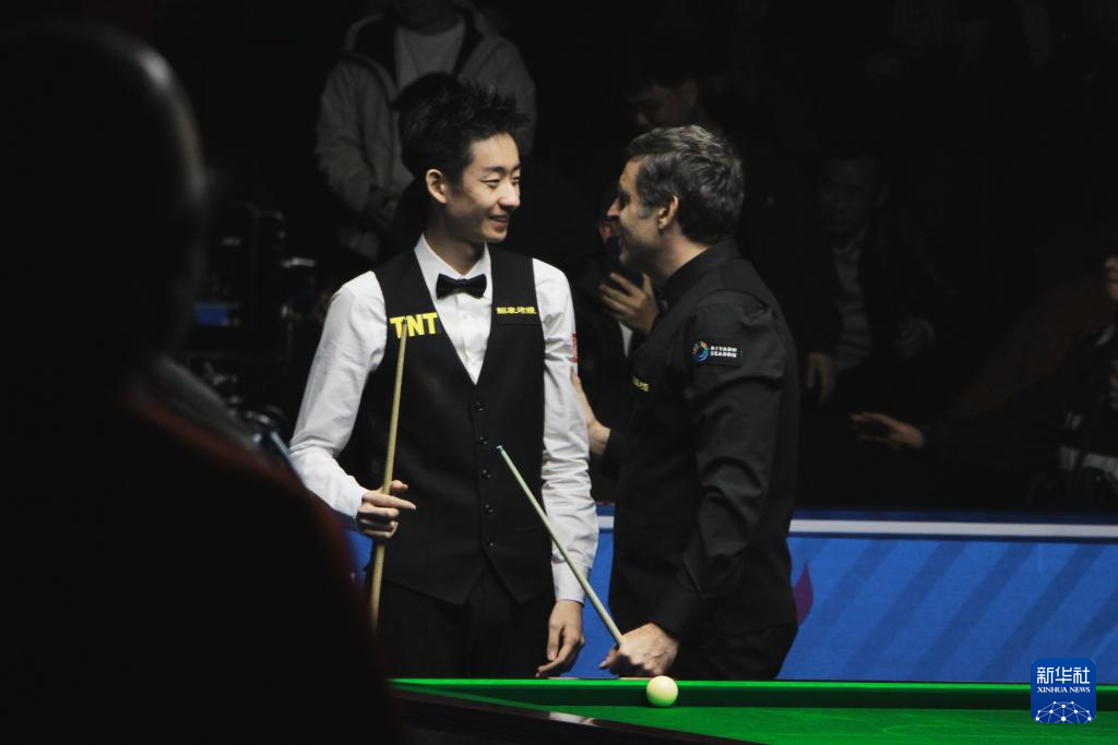 3月21日,奥沙利文(右)和吴宜泽在比赛后交谈。