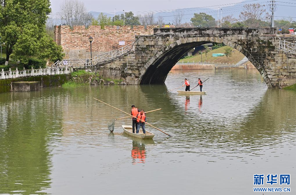 3月21日,在江西省宜春市万载县康乐街道龙河段,志愿者正在巡河护水,清理河面漂浮垃圾。新华网发 邓龙华 摄