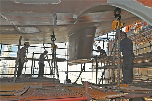 2025年9月19日,工人在合作安装船舶的轴舵系。